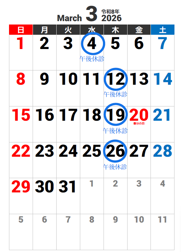 3/4・3/12・3/19・3/26の午後 の診療は休診とさせていただきます。