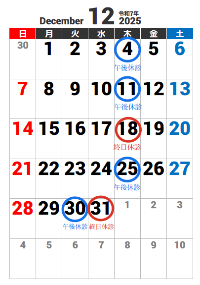 12/4・12/11・12/25・12/30の午後 の診療は休診とさせていただきます。