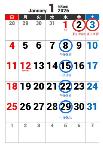 1/8・1/15・1/22・1/29の午後 の診療は休診とさせていただきます。